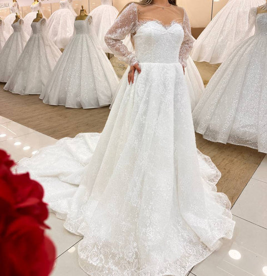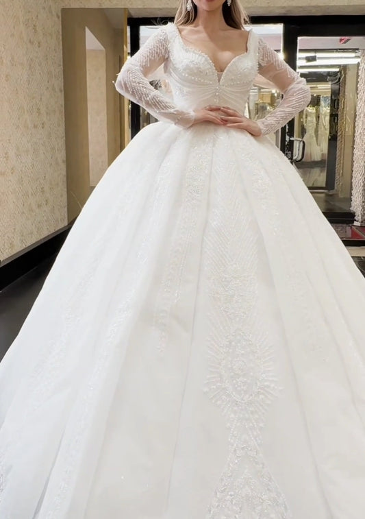 Robe de Mariée Princesse Luxury, Manches Longues, Col Coeur avec Traîne