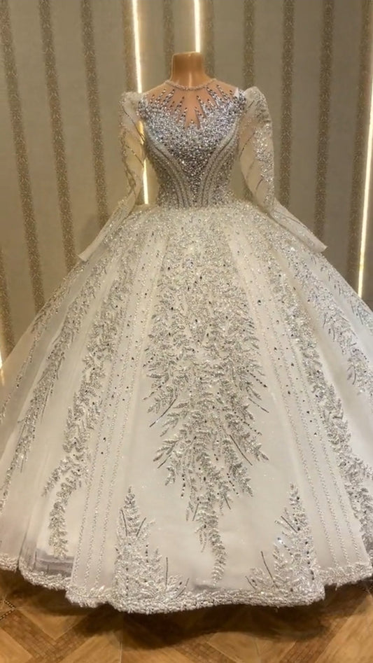 Magnifique Robe de Mariée Princesse Luxury Col Bijou en Strass et Perles, Manches Longues avec Traîne