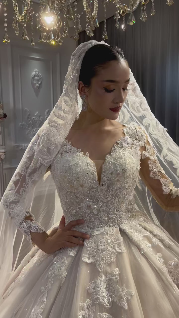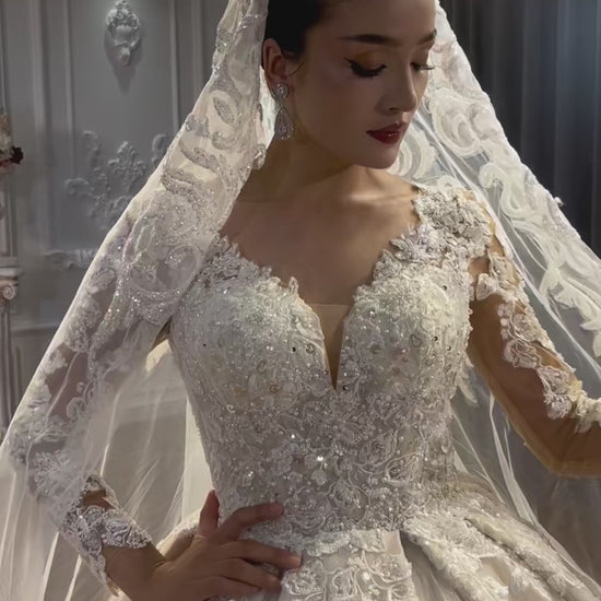 Robe de Mariée Princesse Dentelle Luxury, Manches Longues, Col V avec Traîne.