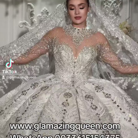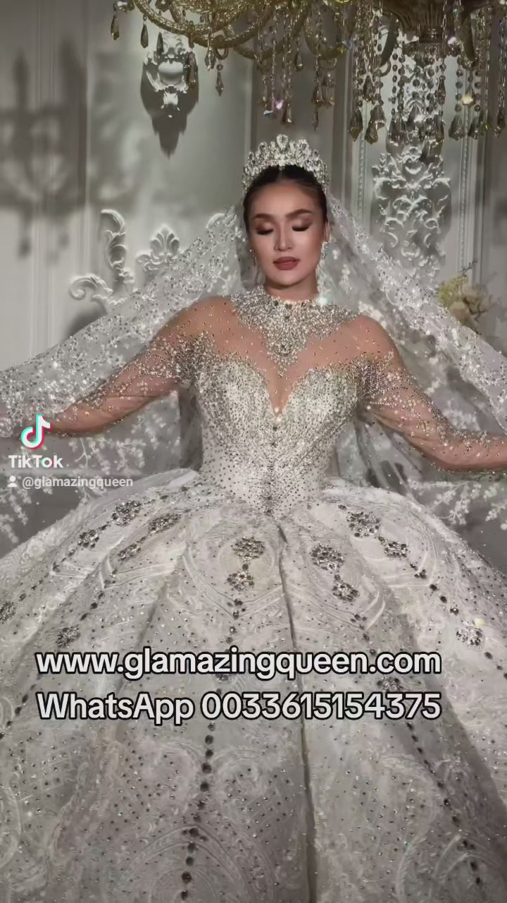 Robe de Mariée Princesse Luxury Queen avec Strass, Manches Longues, Col Bijoux avec Traîne.