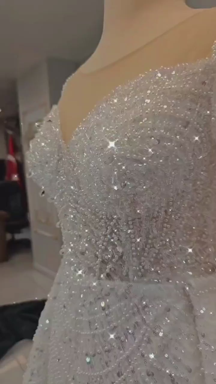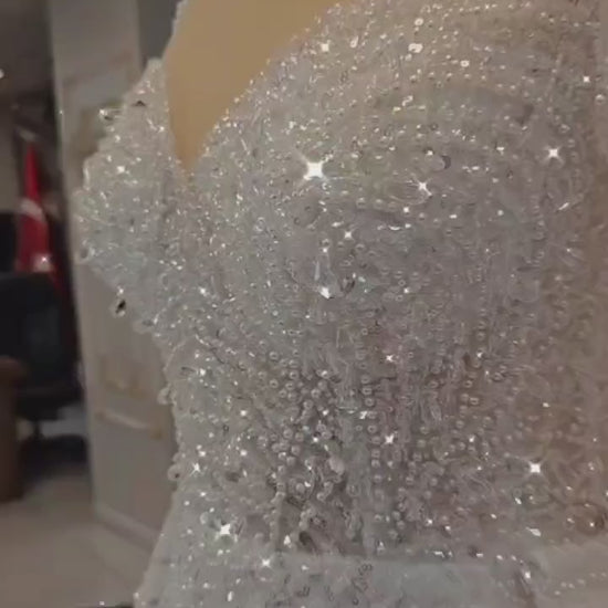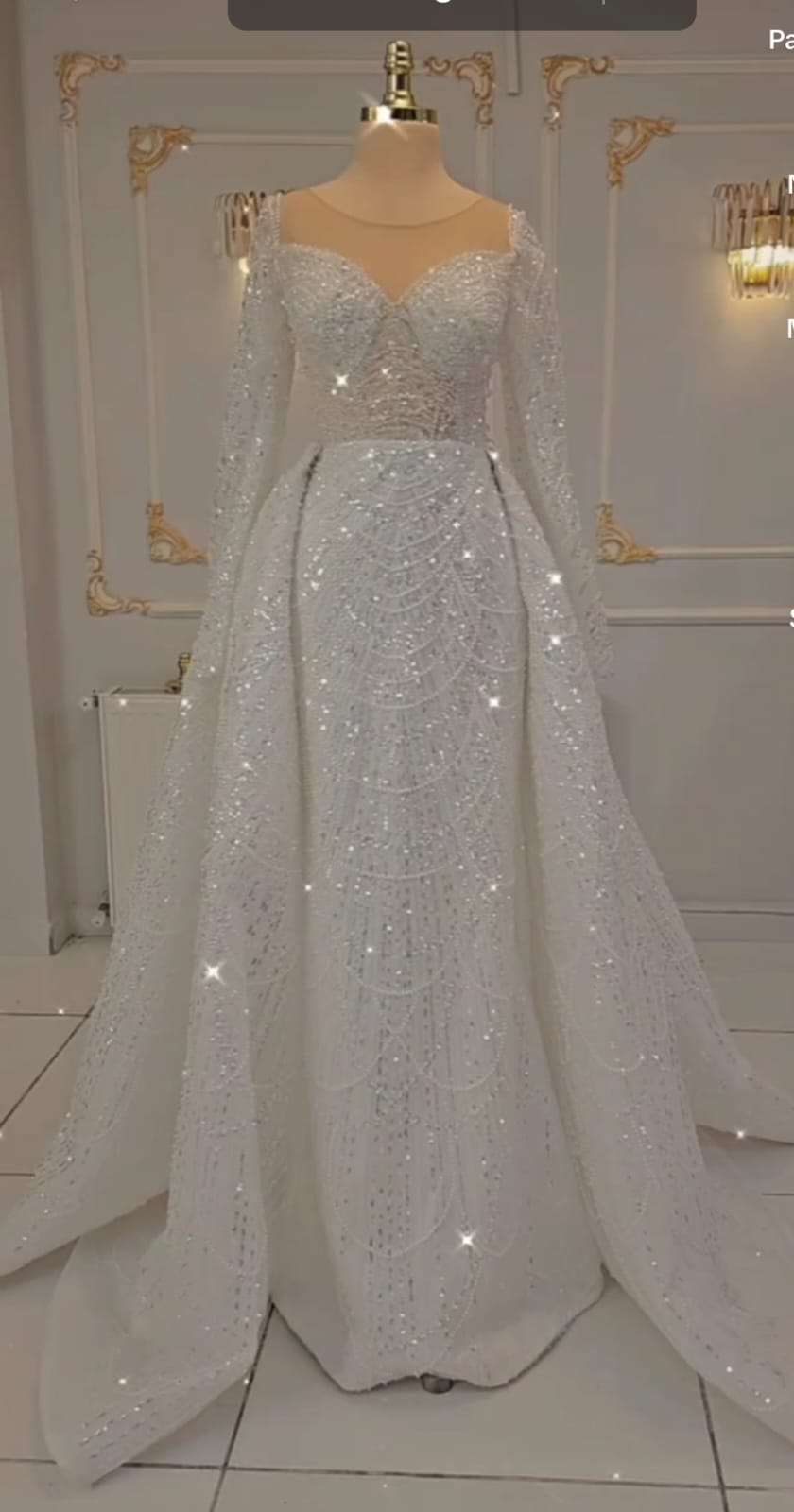 Magnifique Robe de Mariée Sirène Luxury en Perles et Paillettes, Manches Longues, Col Coeur avec Traîne.