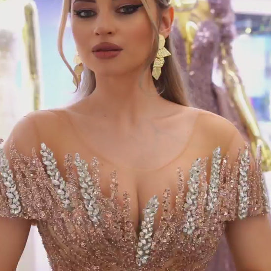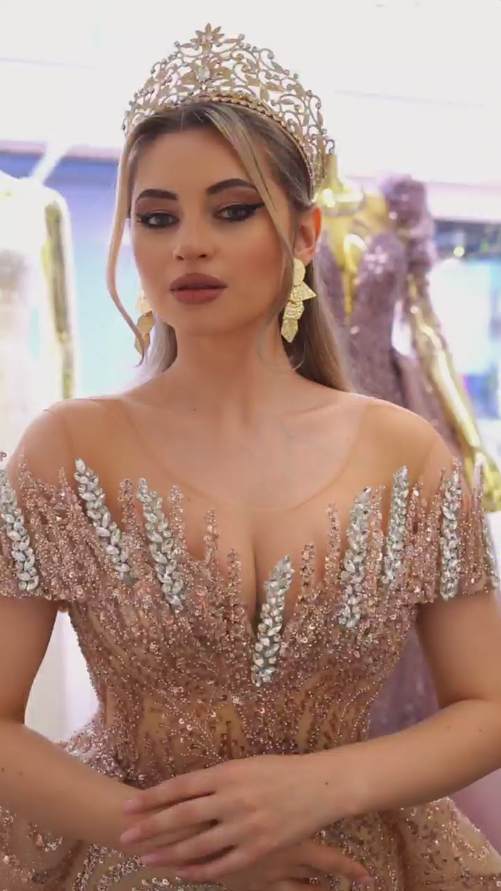 Robe de Mariée Sirène Luxury Doré avec Strass et Paillettes, Col Feuilleté, Épaules Dénudés avec Traîne